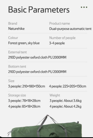 چادر اتوماتیک نیچرهایک 3-4 نفره | naturehike automatic tent (NH21ZP008)