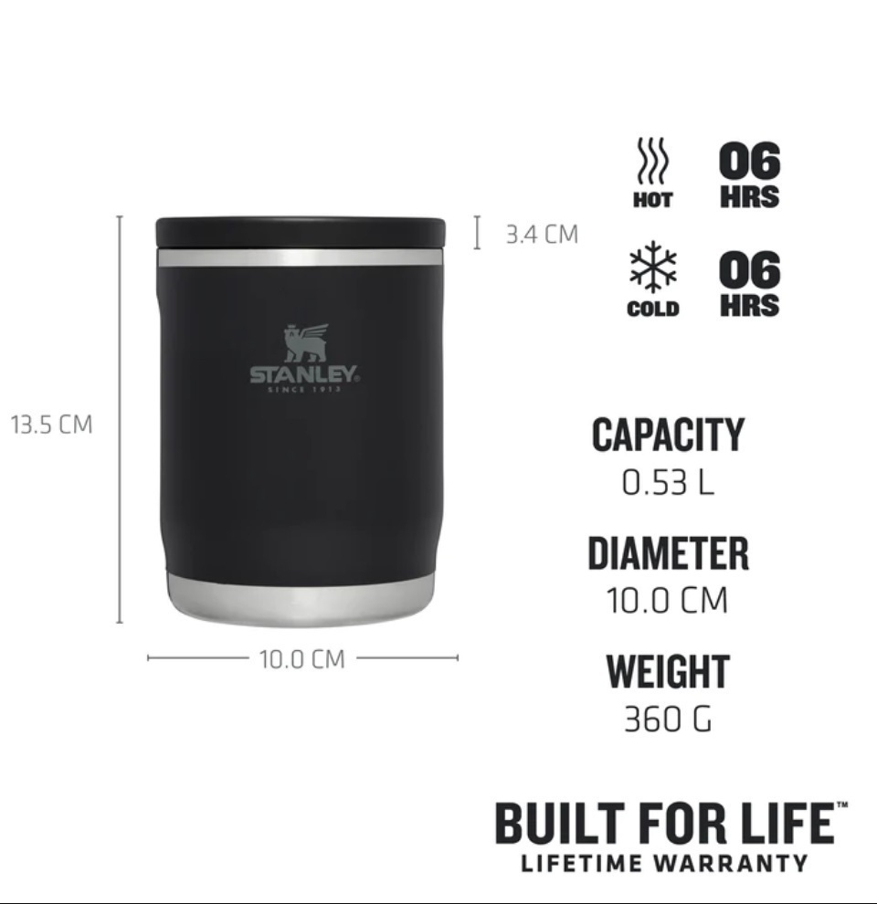 فلاسک غذای استنلی مدل TO-GO FOOD JAR – حجم ۵۳۰ میلی لیتر سری ADVENTURE, یک فلاسک مناسب برای تمامی افراد در تمامی مکان ها. وقتی بیرون از خانه هستید، هیچ چیز به اندازه یک ناهار گرم یا میان وعده سرد در محل کار یا هنگام سفرهای ماجراجویانه و یا حتی در روز های طولانی در مدرسه مزه نمی دهد. از سوپ گرفته تا پاستا، میوه یا ماست و هر چیز دیگری را شما می توانید در این فلاسک با خود حمل کنید. صبح ها ظرف غذای Adventure To-Go را با غذا و یا مواد غذایی دلخواه خود پر کنید و نگران سرد و یا گرم شدن غذای خود نباشید چرا که عایق دو جداره کار خود را انجام می دهد و همه چیز را سرد یا گرم نگه می دارد و زمانی که شما قصد خوردن غذا را دارید برای شما آماده است. این فلاسک غذا ضد نشتی بوده و دارای بسته بندی فوق العاده مدرن و ساده می باشد . فقط فلاسک غذای استنلی را پر کنید و آن را در کیف خود قرار دهید و به راحتی آن را با خود حمل کنید. فلاسک غذای استنلی مدل TO-GO FOOD JAR قدرت نگهداری 4 ساعته سرد و گرم را دارد