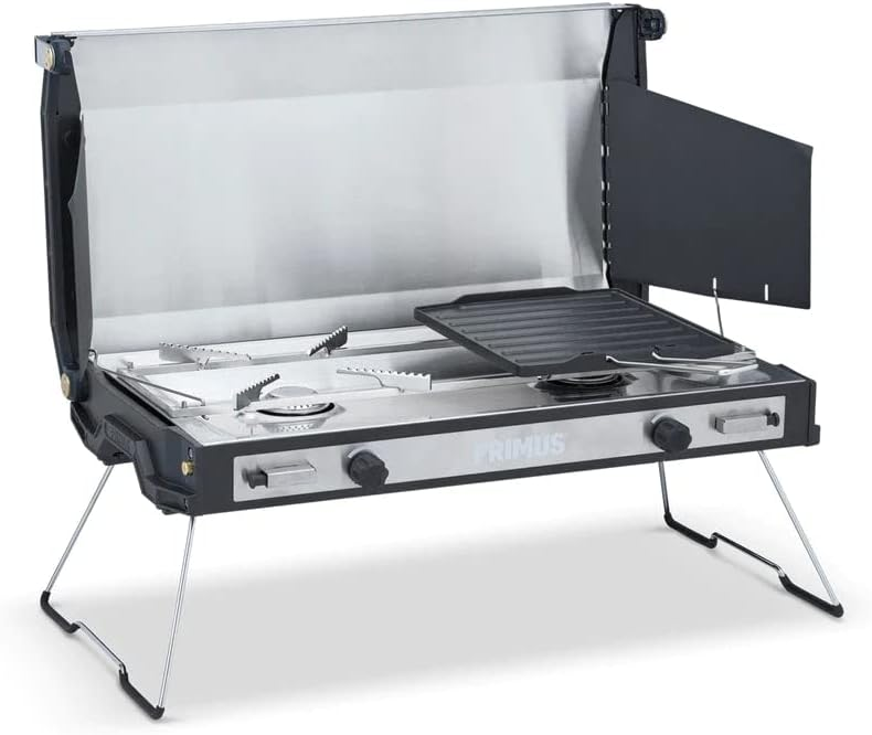 دارای دو شعله پایه تاشو دسته و درپوشی با چوب هایی از جنس بلوط دارای دو عدد محافظ باد برای جلوگیری از خاموشی شعله هنگام وزش باد دارای پایه های دوگانه تا شونده دارای تزئینات مخصوص از جنس برنج استفاده از استیل ضد زنگ با کیفیت بسیار بالا وبا دوام زیاد دارای کیف حمل قابلیت شست و شو