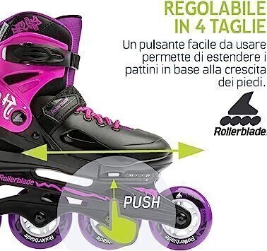 – اسکیت رولربلید بچگانه مدل فیوری جی Fury G قابلیت تغییر سایز آسان تا 4 سایز را دارد که براحتی میتوانید این عمل را انجام دهید به نحوی که بعد از آزاد کردن دکمه و فشار دادن آن با کشیدن ساق اسکیت به سمت عقب، سایز کفش اسکیت به راحتی تغییر میکند.